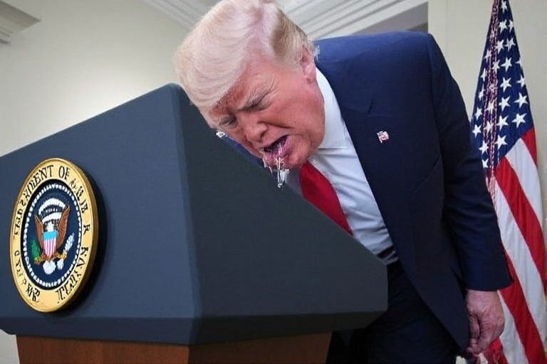 Three months before, in July 2025, the White House announced that Trump had been diagnosed with chronic venous insufficiency, a common condition in older adults that causes blood to pool in the legs. This diagnosis was used to explain visible swelling in his lower legs and bruising on his hands. Ergo, he has blood pooling in his legs and spit pooling in his mouth.
